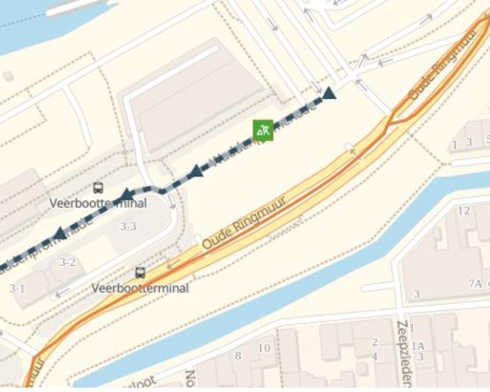 - Voetganders van en naar de terminal worden omgeleid via het voetpad aan de stadszijde.