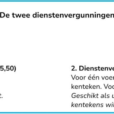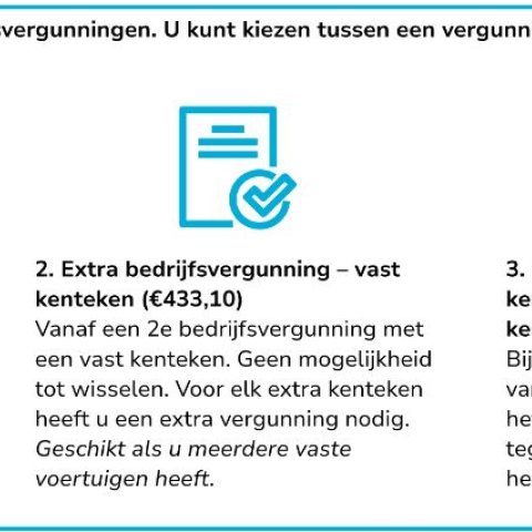 Bedrijven kunnen een nieuwe online vergunning aanvragen voor voertuigen met verschillende kentekens. U heeft dan nog maar één vergunning nodig. Gebruikt u een ander voertuig? Dan kunt u het kenteken zelf aanpassen in het Digitaal Loket Parkeren. De papieren vergunning voor meerdere kentekens verdwijnt. Voor deze vergunning heeft u eHerkenning nodig. Meer informatie vindt u op de website van de Rijksoverheid.